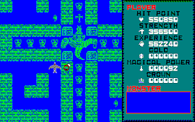 Dragon Slayer, despite being called one by several sources, isn't really an action RPG, but rather a turn-based game on a timer, like Caverns of Freitag. Unlike its contemporaries Tower of Druaga and Hydlide, you could easily turn this game into something purely turn-based simply by removing the timer aspect, and nothing in its space of gameplay possibilities would be lost except for the possibility of failure to keep up with its frenetic pace. Dragon Slayer even provides the means to do this - unlike Freitag, you can pause any time with the Esc key, giving you unlimited time to think over your next move anyway. This is not, contrary to Wikipedia's description, remotely how arcade-style action mechanics work, and I can't really see it as a foundational to the eventual incorporation of action mechanics into RPG-like games either.